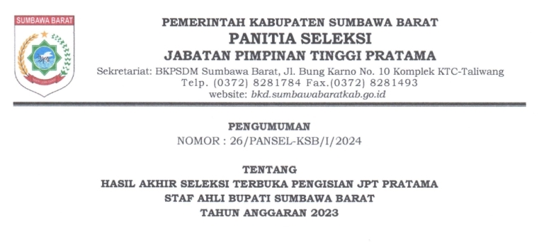 Read MoreTaliwang, MediaKSB,- Pemerintah Kabupaten Sumbawa Barat (KSB) melalui tim Panitia Seleksi (Pansel), telah mengumumkan kandidat untuk mengisi jabatan staf ahli Bupati